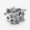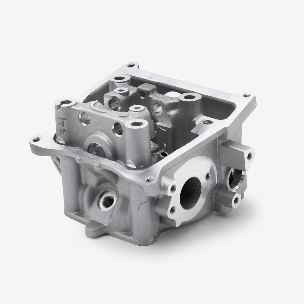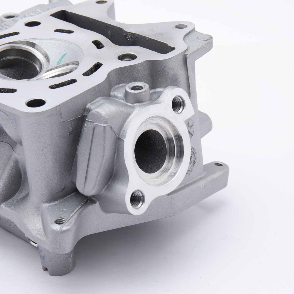 The cylinder head in a motorcycle is a critical engine component that sits atop the cylinder block, housing the intake and exhaust valves, camshaft, and other vital elements. It facilitates the intake of air-fuel mixture and the expulsion of exhaust gases, while also sealing the combustion chamber to ensure efficient engine performance and power generation.