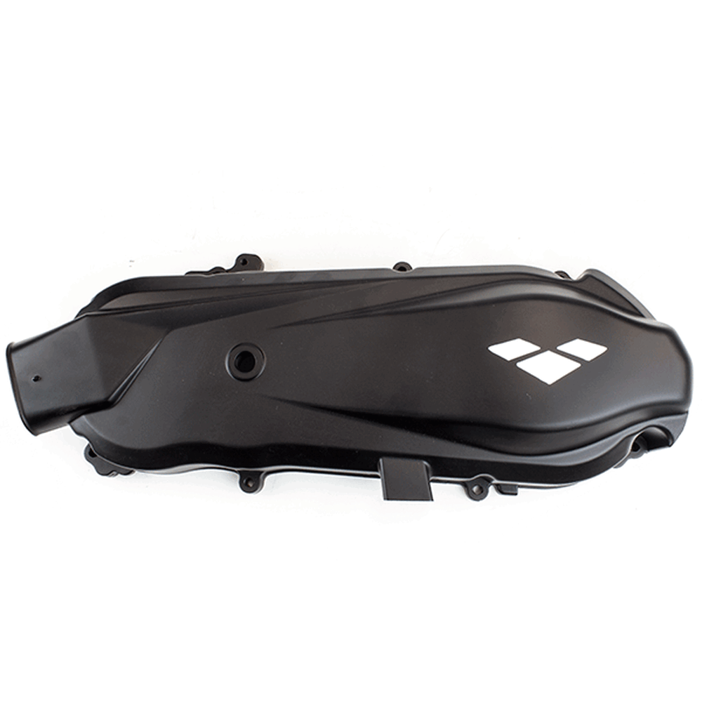 The drive belt cover in a CVT (Continuously Variable Transmission) system on a scooter or motorcycle protects the drive belt and pulleys from debris, dust, and damage. It also helps ensure proper tension and alignment of the belt while contributing to the system's overall safety and efficiency.