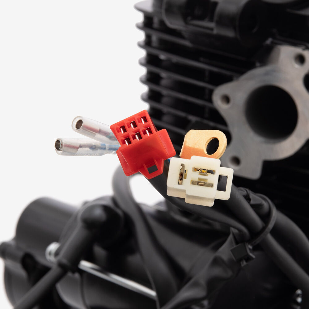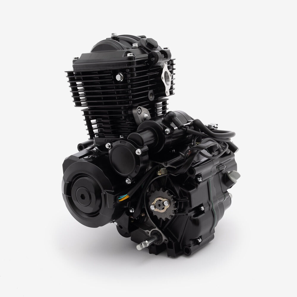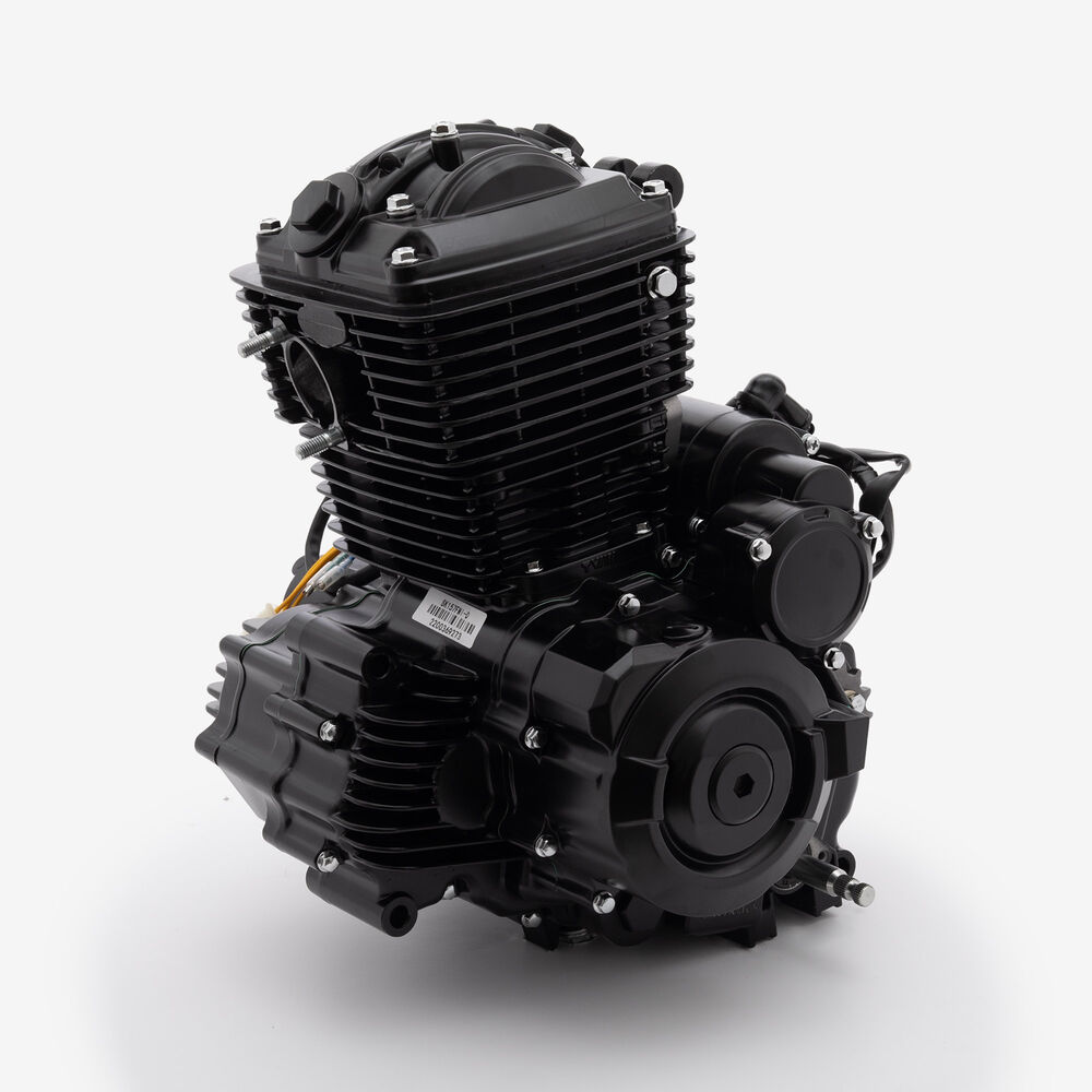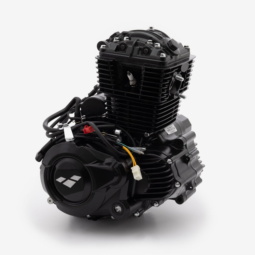 The complete engine in a motorcycle encompasses all internal and external components necessary for operation, including the engine block, cylinders, pistons, crankshaft, camshaft.