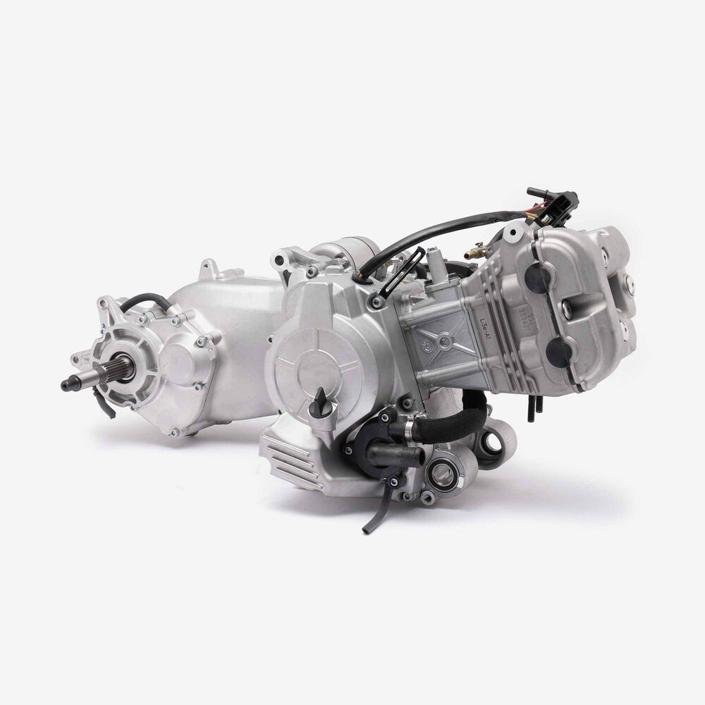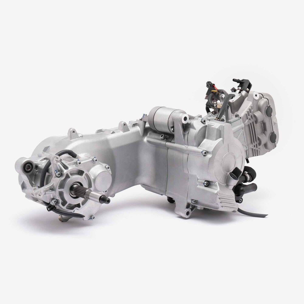 The complete engine in a motorcycle encompasses all internal and external components necessary for operation, including the engine block, cylinders, pistons, crankshaft, camshaft.
