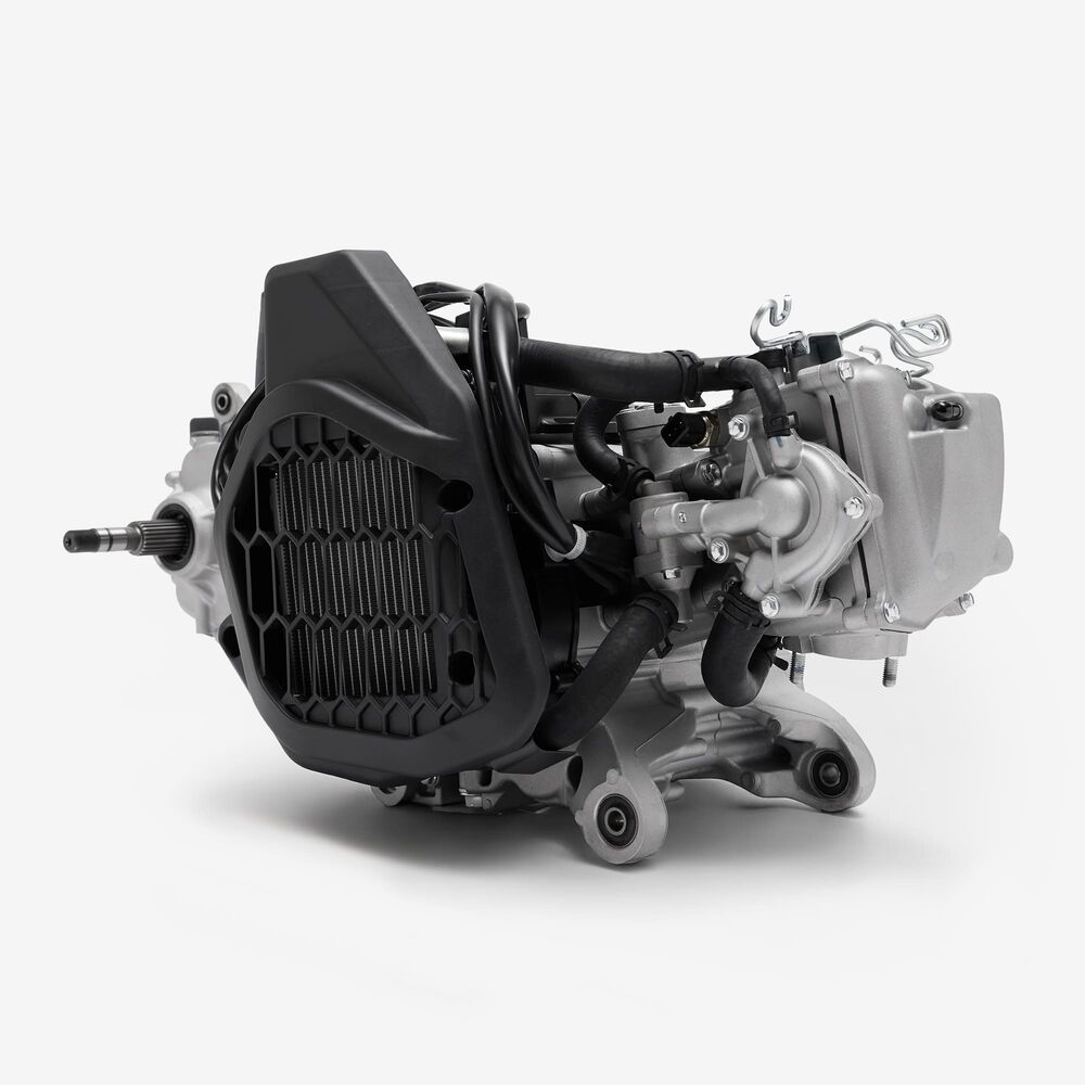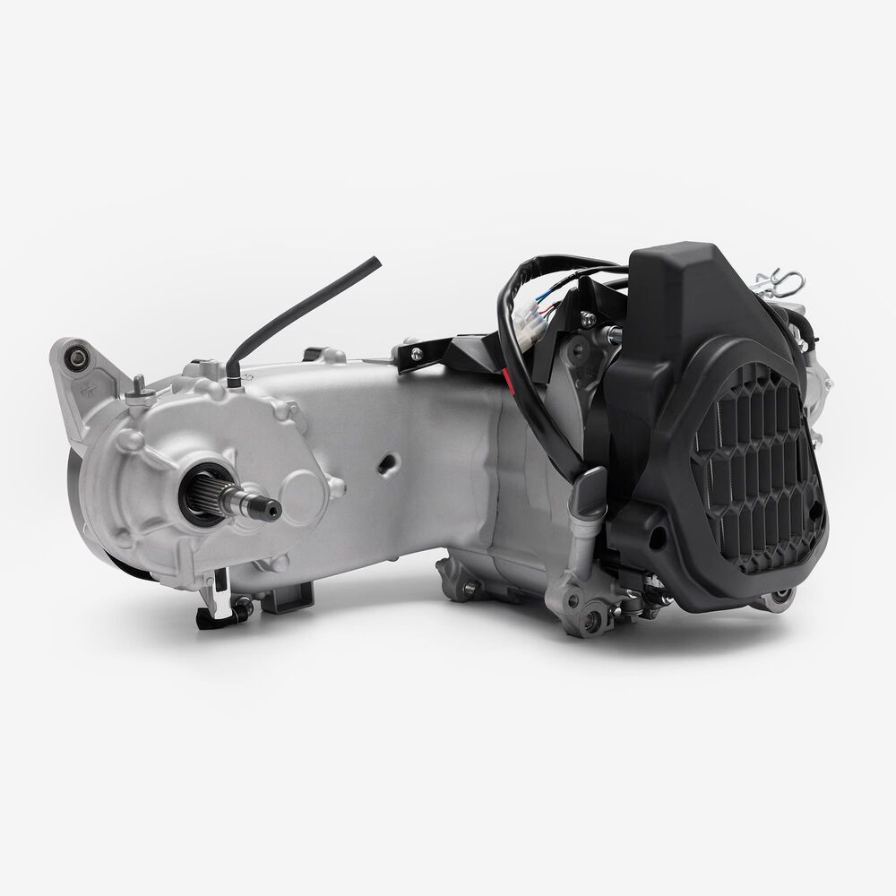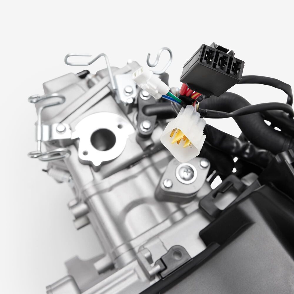 The complete engine in a motorcycle encompasses all internal and external components necessary for operation, including the engine block, cylinders, pistons, crankshaft, camshaft.