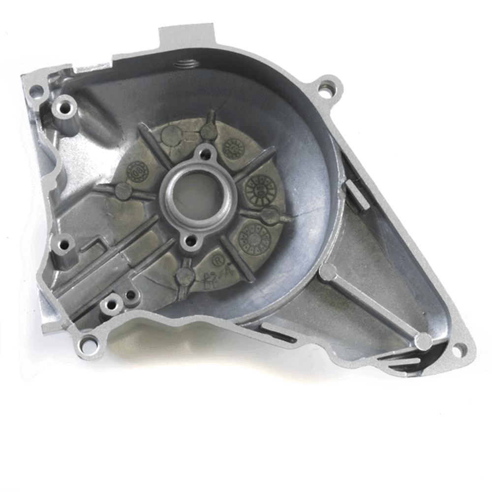 The left engine casing in a motorcycle encloses and protects the engine's internal components on the left side, ensuring structural integrity and safeguarding against dirt, debris, and damage.