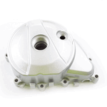 The left engine casing in a motorcycle encloses and protects the engine's internal components on the left side, ensuring structural integrity and safeguarding against dirt, debris, and damage.