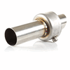 The exhaust baffle in a motorcycle reduces noise by directing exhaust gases through internal chambers and perforations, helping to manage sound levels while maintaining efficient exhaust flow.