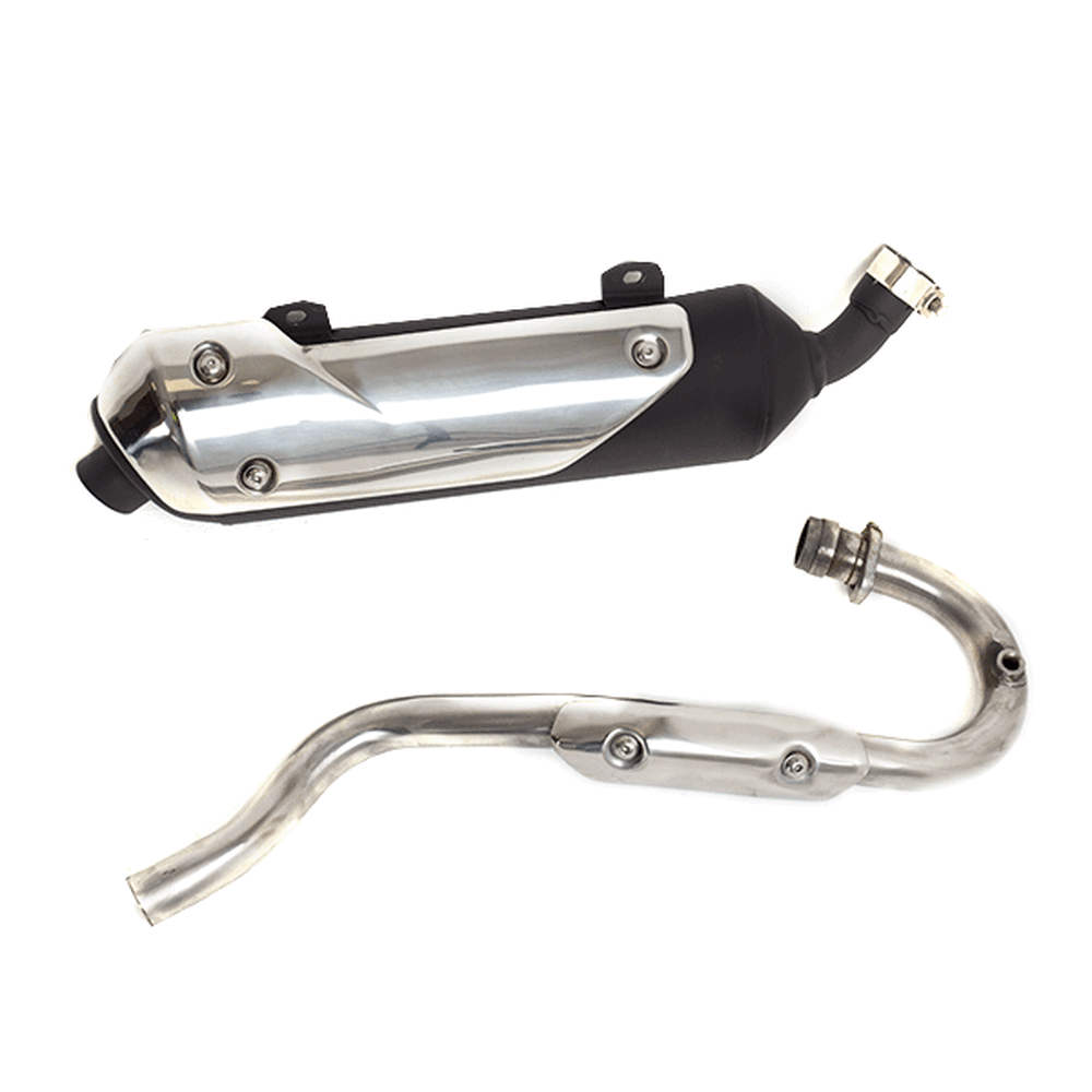The complete exhaust system in a motorcycle includes all components from the engine's exhaust ports to the exhaust tip, responsible for directing exhaust gases away from the engine, reducing noise, and improving performance and emissions control.