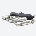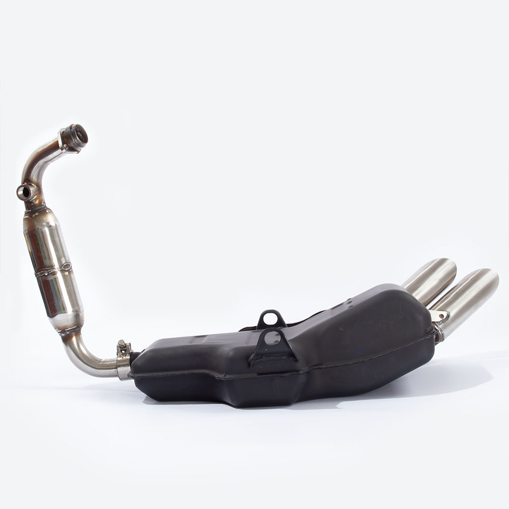 The complete exhaust system in a motorcycle includes all components from the engine's exhaust ports to the exhaust tip, responsible for directing exhaust gases away from the engine, reducing noise, and improving performance and emissions control.