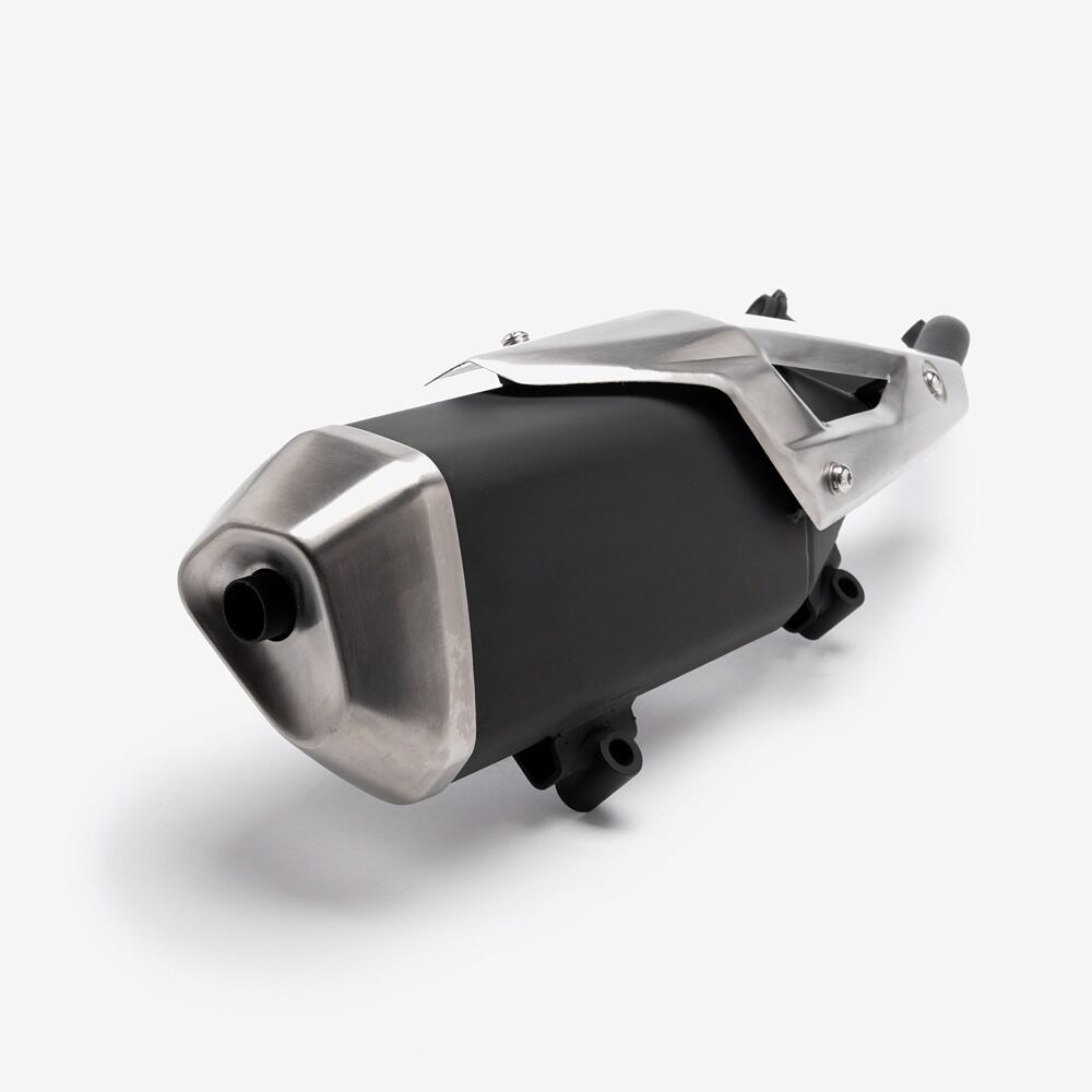 The complete exhaust system in a motorcycle includes all components from the engine's exhaust ports to the exhaust tip, responsible for directing exhaust gases away from the engine, reducing noise, and improving performance and emissions control.
