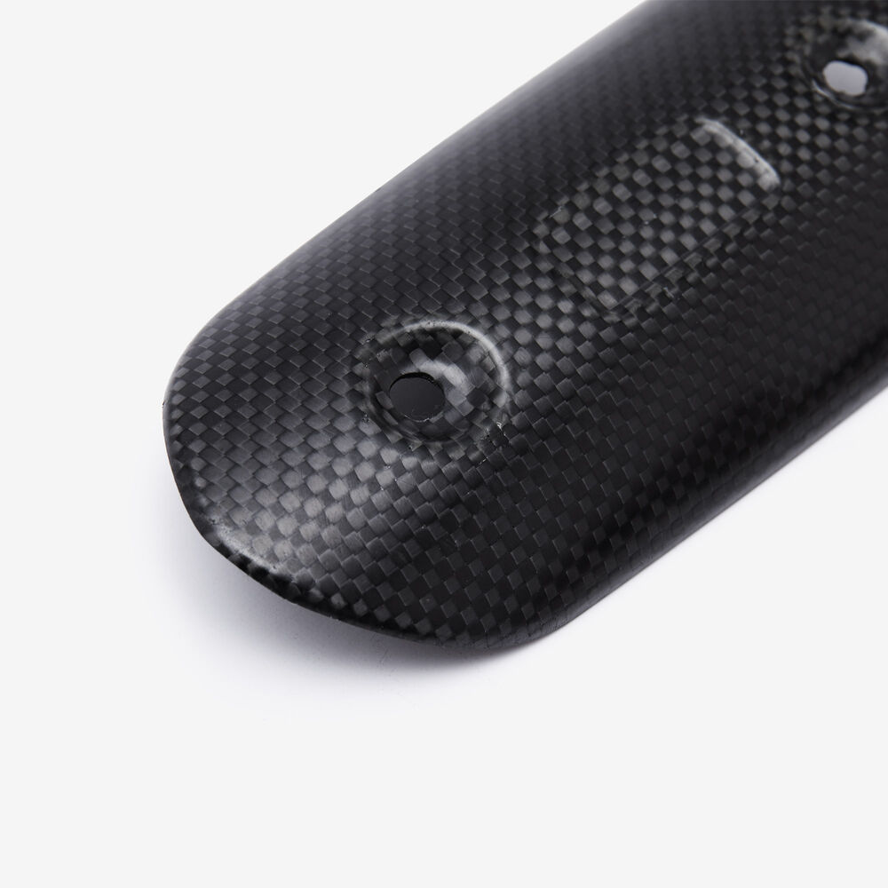 The exhaust guard in a motorcycle protects the rider from burns by covering hot exhaust components and preventing accidental contact, while also shielding the exhaust from damage.