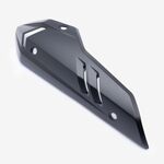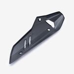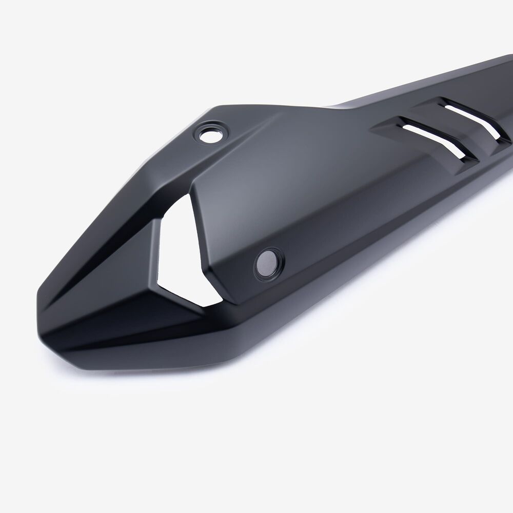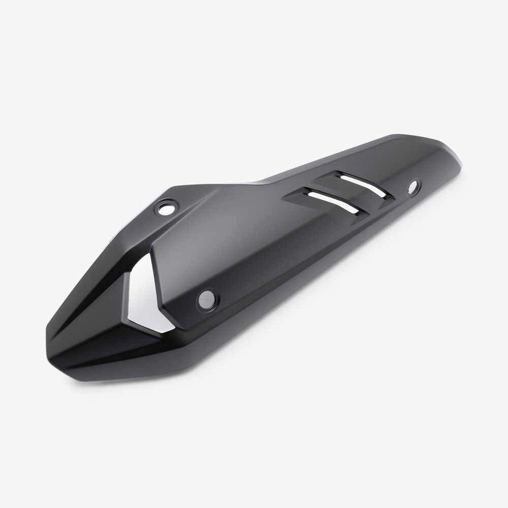 The exhaust guard in a motorcycle protects the rider from burns by covering hot exhaust components and preventing accidental contact, while also shielding the exhaust from damage.