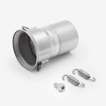 The exhaust fitting or fixing kit in a motorcycle includes all necessary hardware, such as bolts, gaskets, and clamps, for securely mounting and sealing the exhaust system components to the bike.