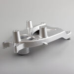The exhaust mounting bracket in a motorcycle secures the exhaust system to the frame, providing stability and reducing vibrations.