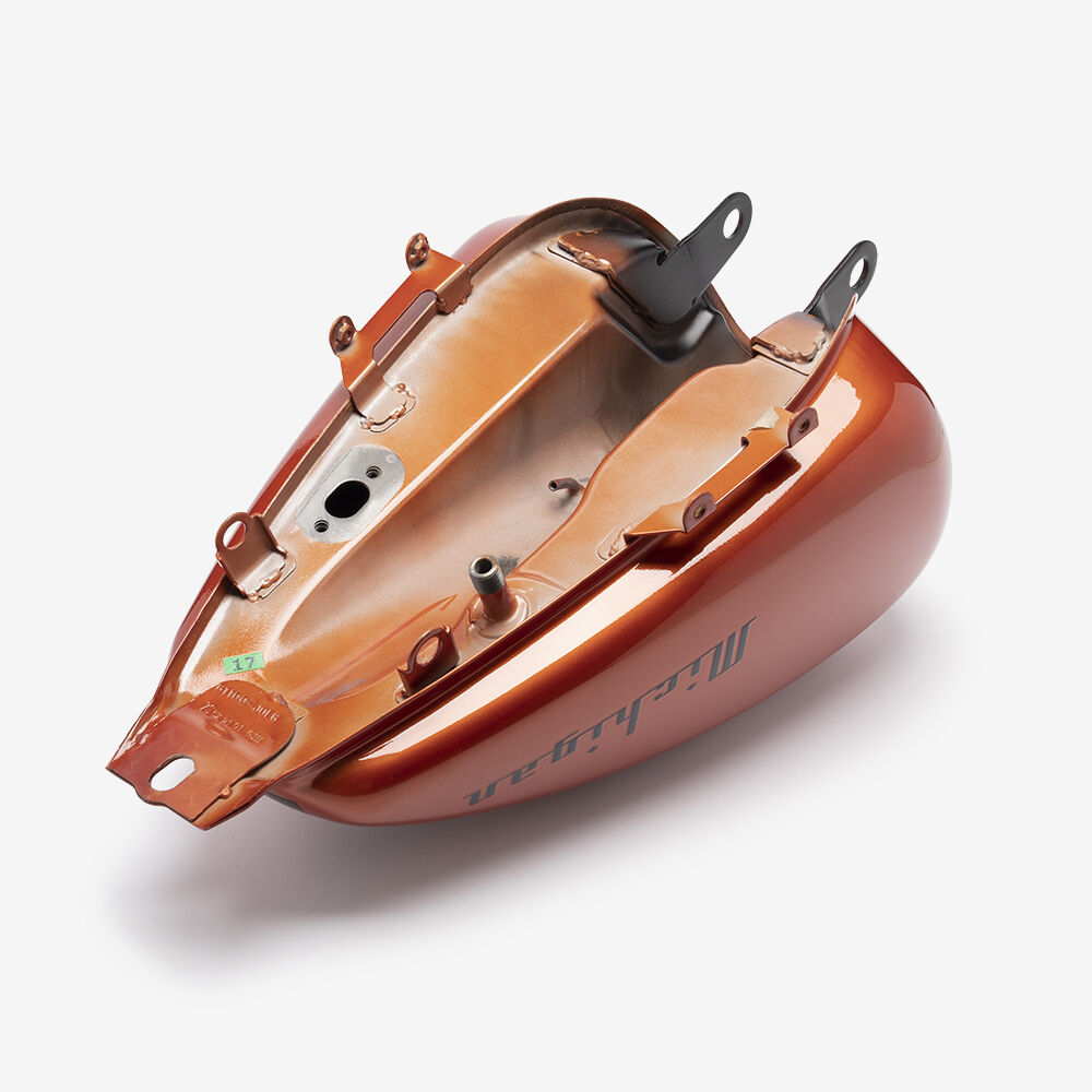 The fuel tank in a motorcycle stores and supplies fuel to the engine, ensuring a steady flow of fuel for combustion while also serving as a key component of the bike's design and ergonomics.