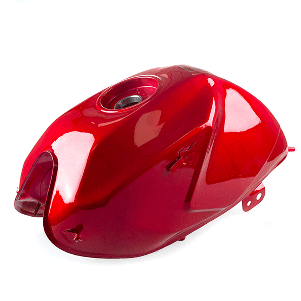 The fuel tank in a motorcycle stores and supplies fuel to the engine, ensuring a steady flow of fuel for combustion while also serving as a key component of the bike's design and ergonomics.