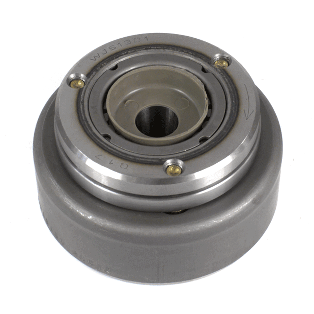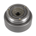 The flywheel in a motorcycle stores rotational energy from the engine, helping to smooth out power delivery and maintain consistent engine performance by reducing fluctuations in engine speed.