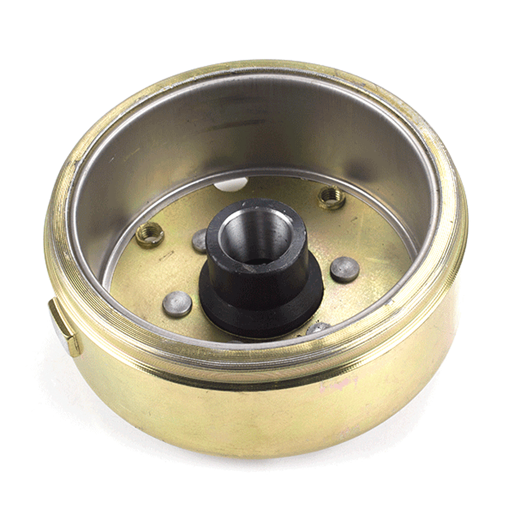 The flywheel in a motorcycle stores rotational energy from the engine, helping to smooth out power delivery and maintain consistent engine performance by reducing fluctuations in engine speed.