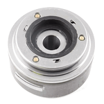 The flywheel in a motorcycle stores rotational energy from the engine, helping to smooth out power delivery and maintain consistent engine performance by reducing fluctuations in engine speed.
