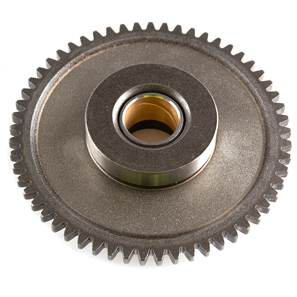 The flywheel in a motorcycle stores rotational energy from the engine, helping to smooth out power delivery and maintain consistent engine performance by reducing fluctuations in engine speed.