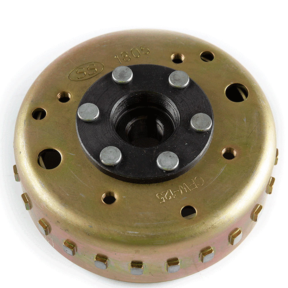 The flywheel in a motorcycle stores rotational energy from the engine, helping to smooth out power delivery and maintain consistent engine performance by reducing fluctuations in engine speed.