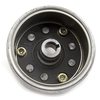 The flywheel in a motorcycle stores rotational energy from the engine, helping to smooth out power delivery and maintain consistent engine performance by reducing fluctuations in engine speed.