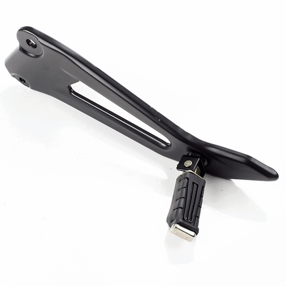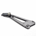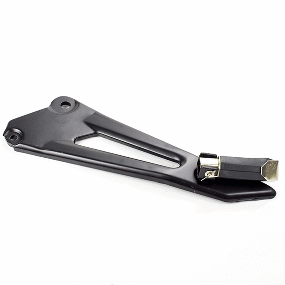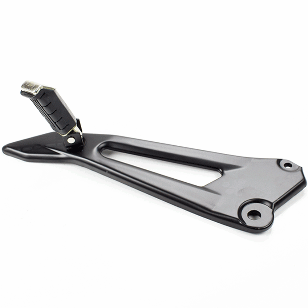 The footpeg bracket in a motorcycle mounts the footpegs securely to the frame, ensuring proper alignment and stability for the rider's foot while riding.