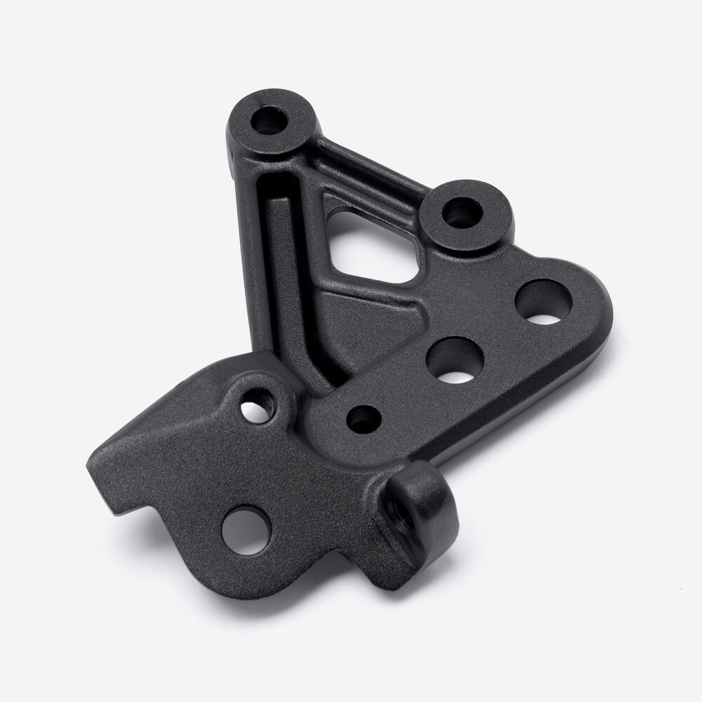 The footpeg bracket in a motorcycle mounts the footpegs securely to the frame, ensuring proper alignment and stability for the rider's foot while riding.