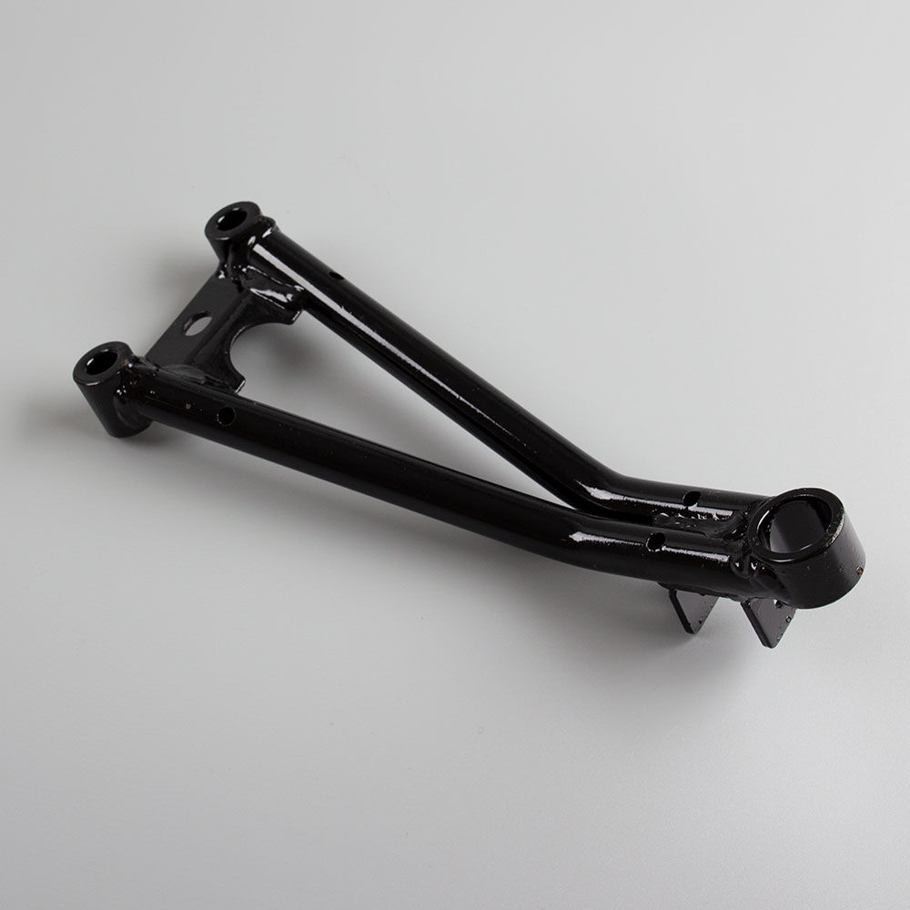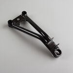 The footpeg bracket in a motorcycle mounts the footpegs securely to the frame, ensuring proper alignment and stability for the rider's foot while riding.