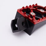 A footpeg and brace set on a motorcycle includes both the footpegs and the accompanying support braces. The footpegs are the parts where the rider rests their feet, while the braces provide additional support and reinforcement to ensure the footpegs stay securely in place, even under stress or rough conditions. This set is often used in off-road or performance bikes, as the braces help prevent footpeg damage or shifting during aggressive riding. The footpegs are typically made from durable materials like aluminum or steel, while the braces provide extra stability and strength.