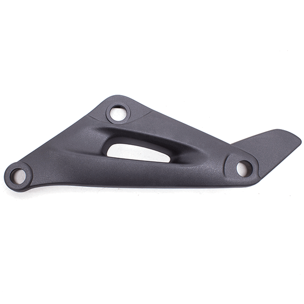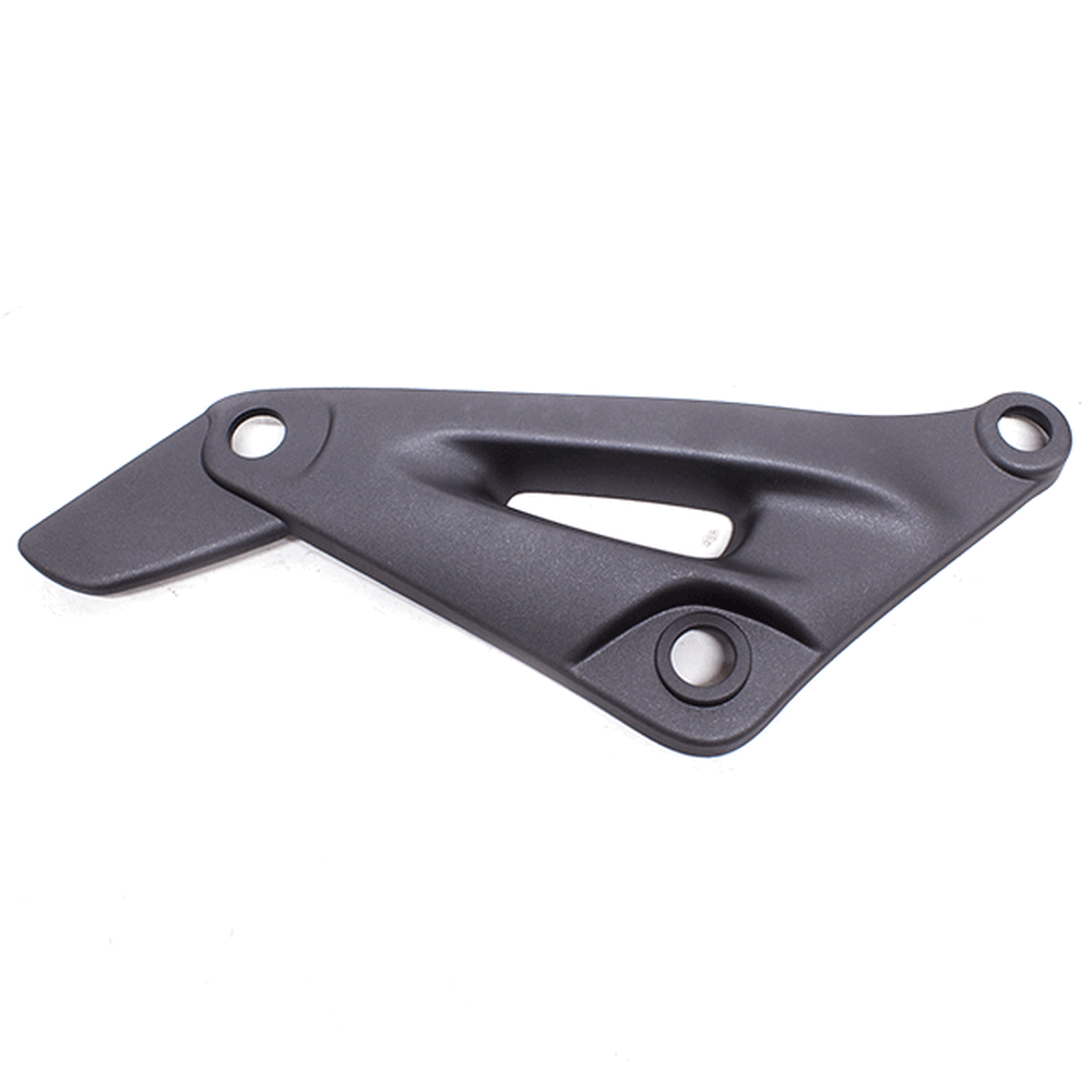 The footpeg frame cover in a motorcycle encases the frame around the footpegs, offering protection from debris and providing a finished appearance while ensuring the rider's foot area remains clean and secure.
