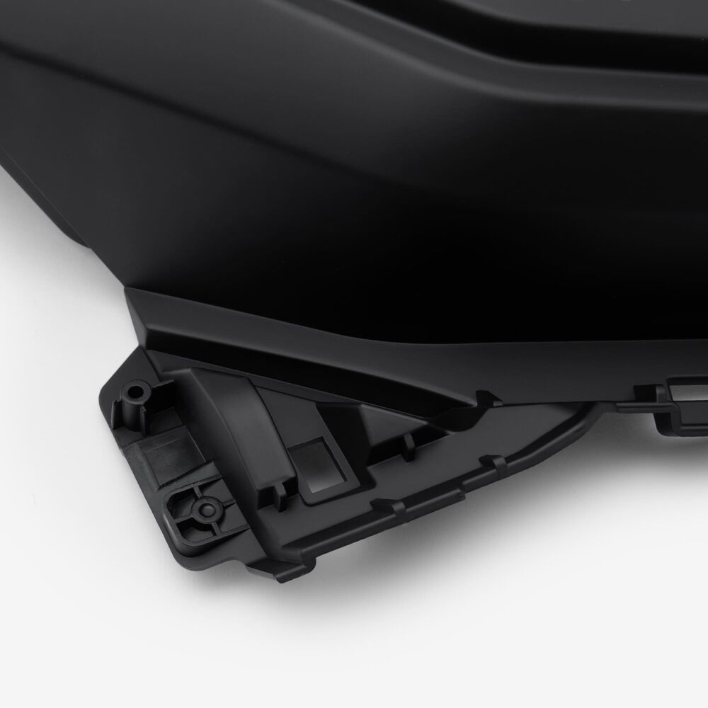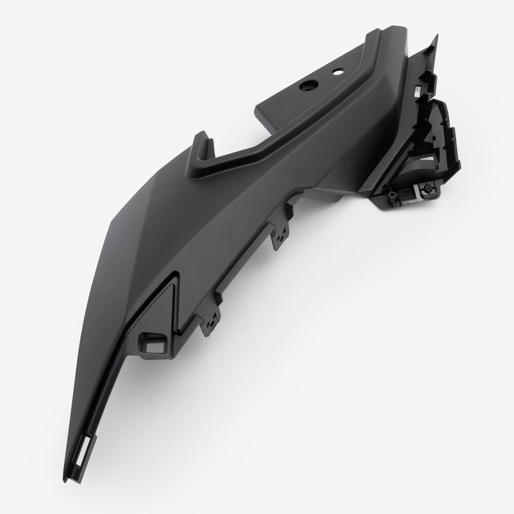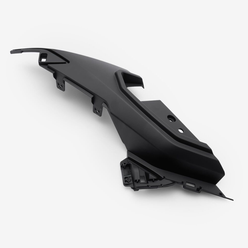 The footpeg frame cover in a motorcycle encases the frame around the footpegs, offering protection from debris and providing a finished appearance while ensuring the rider's foot area remains clean and secure.