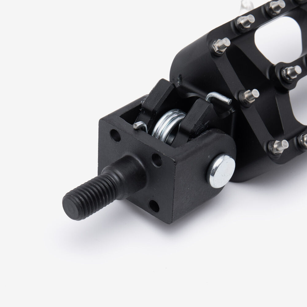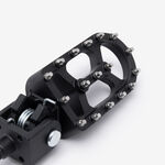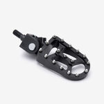 The right footpeg in a motorcycle offers a stable resting point for the rider's foot, aiding in balance and control while riding.