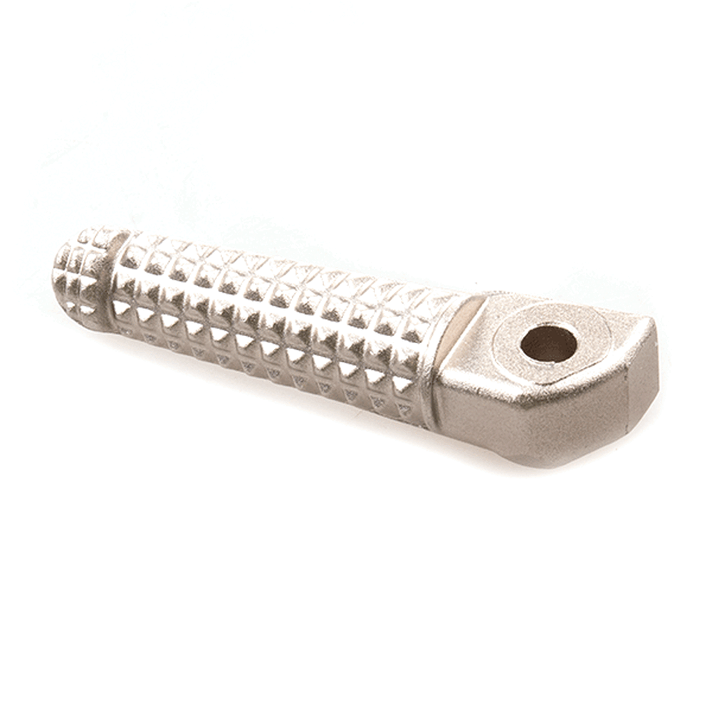 The footpeg in a motorcycle offers a stable resting point for the rider's foot, aiding in balance and control while riding.