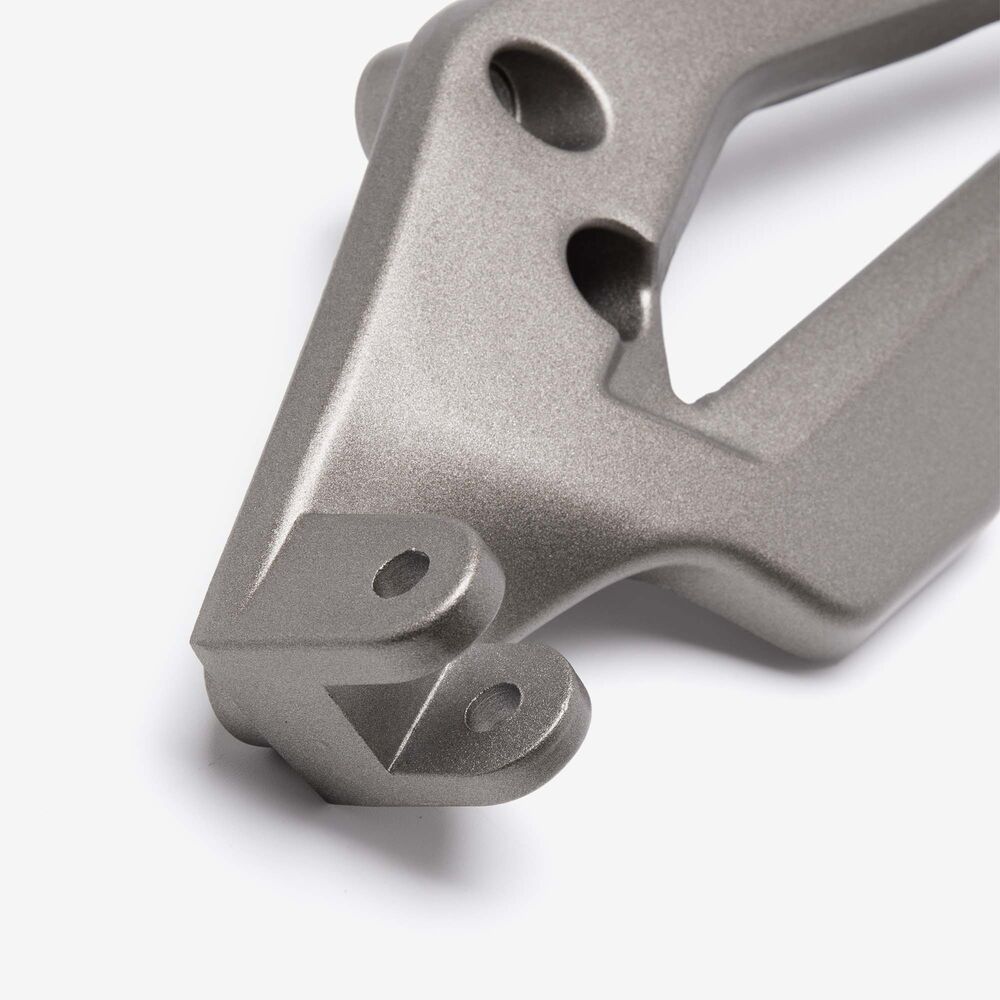 The footpeg in a motorcycle offers a stable resting point for the rider's foot, aiding in balance and control while riding.