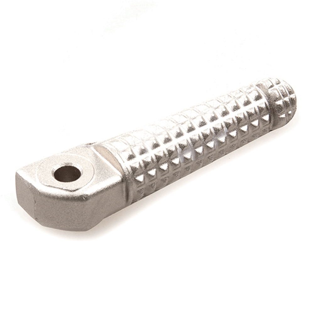 The footpeg in a motorcycle offers a stable resting point for the rider's foot, aiding in balance and control while riding.