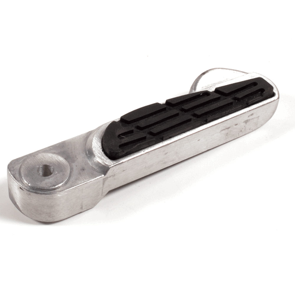 The footpeg in a motorcycle offers a stable resting point for the rider's foot, aiding in balance and control while riding.