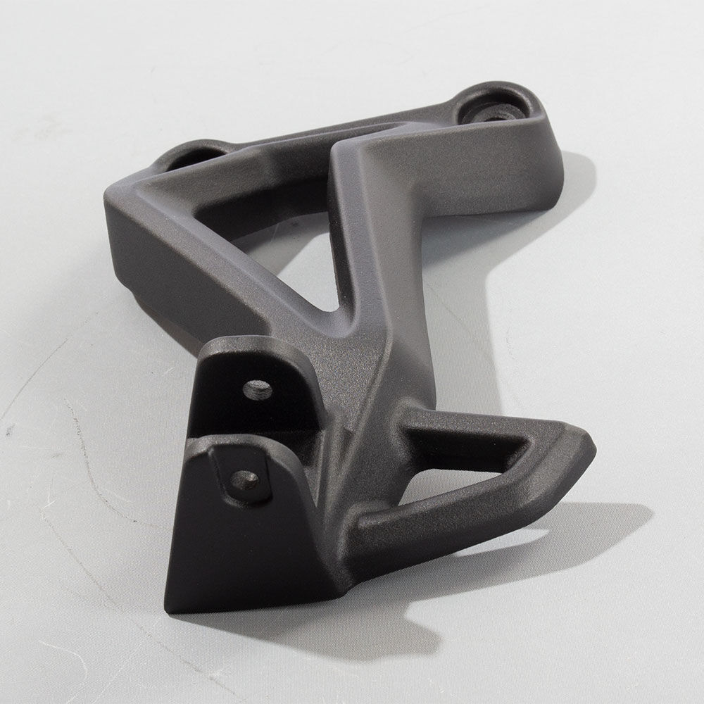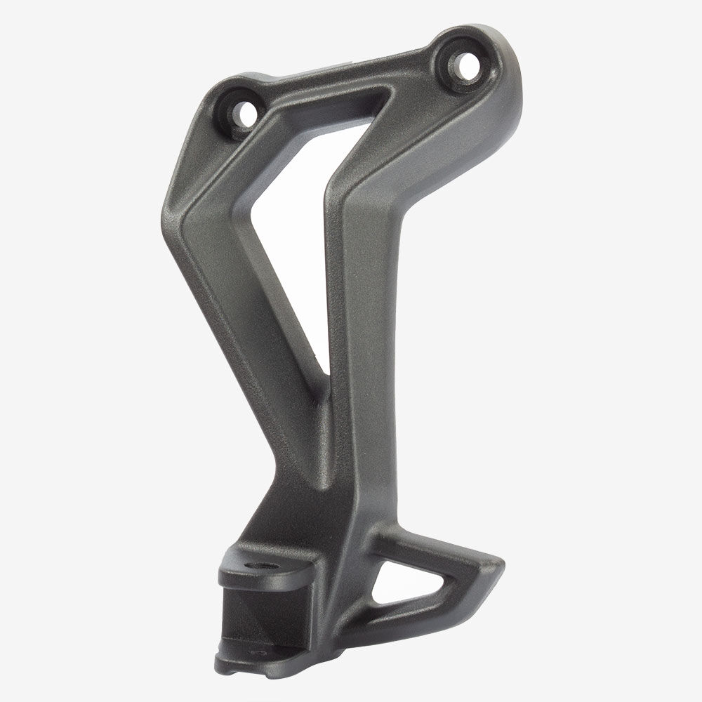 The footpeg with bracket in a motorcycle provides a secure place for the rider's foot while riding, supporting weight and aiding in balance, with the bracket ensuring proper attachment to the frame.