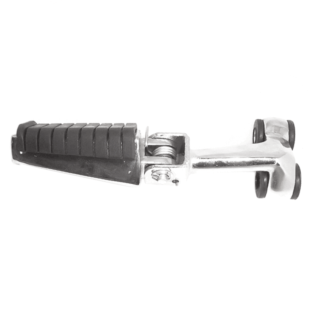 The footpeg with bracket in a motorcycle provides a secure place for the rider's foot while riding, supporting weight and aiding in balance, with the bracket ensuring proper attachment to the frame.