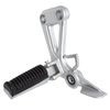 The footpeg with bracket in a motorcycle provides a secure place for the rider's foot while riding, supporting weight and aiding in balance, with the bracket ensuring proper attachment to the frame.