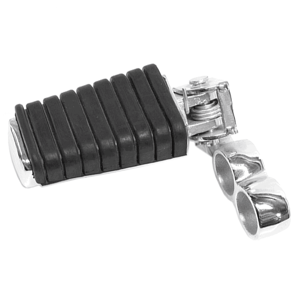 The footpeg with bracket in a motorcycle provides a secure place for the rider's foot while riding, supporting weight and aiding in balance, with the bracket ensuring proper attachment to the frame.