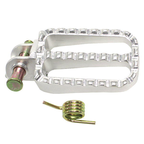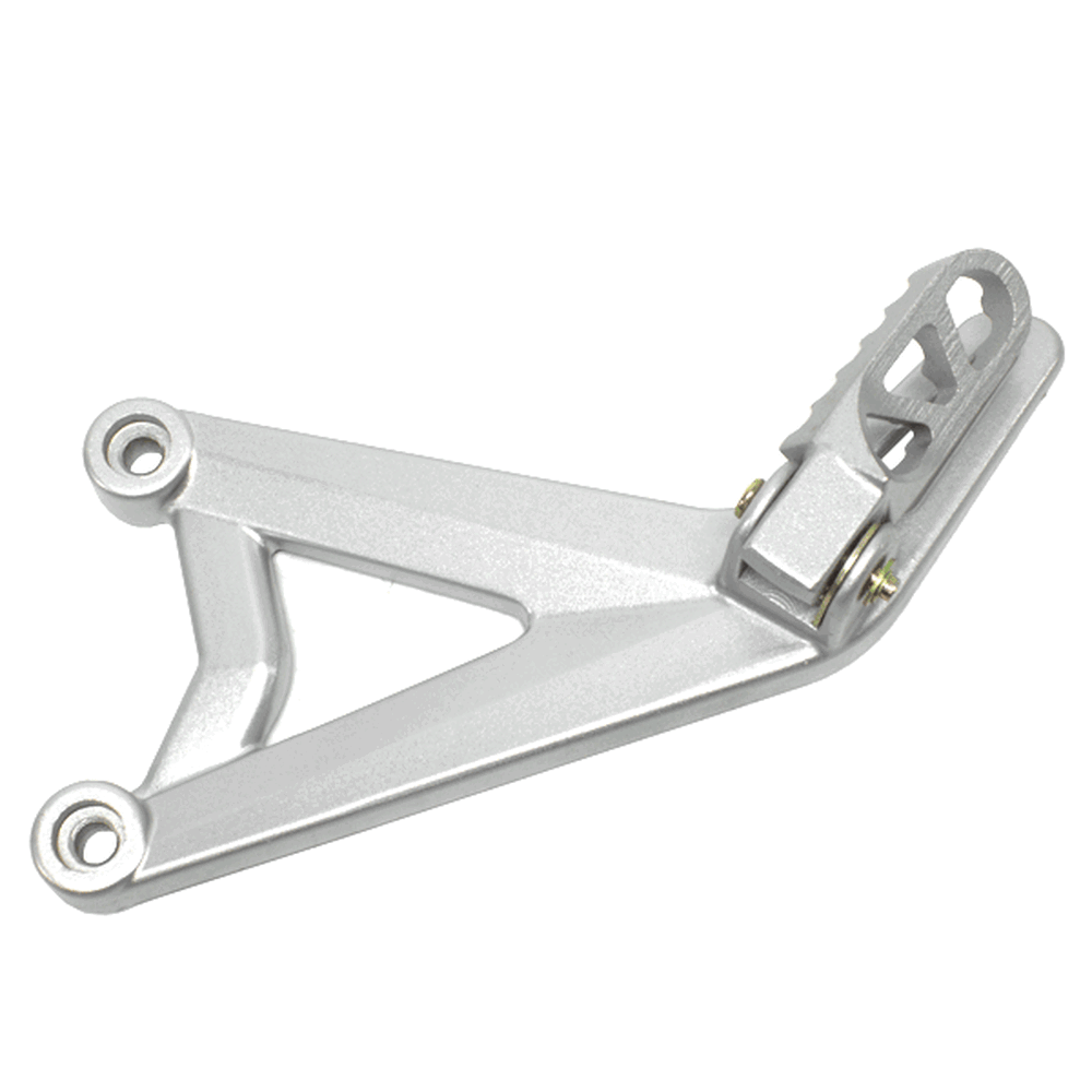 The footpeg with bracket in a motorcycle provides a secure place for the rider's foot while riding, supporting weight and aiding in balance, with the bracket ensuring proper attachment to the frame.
