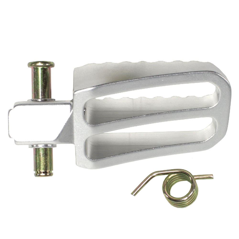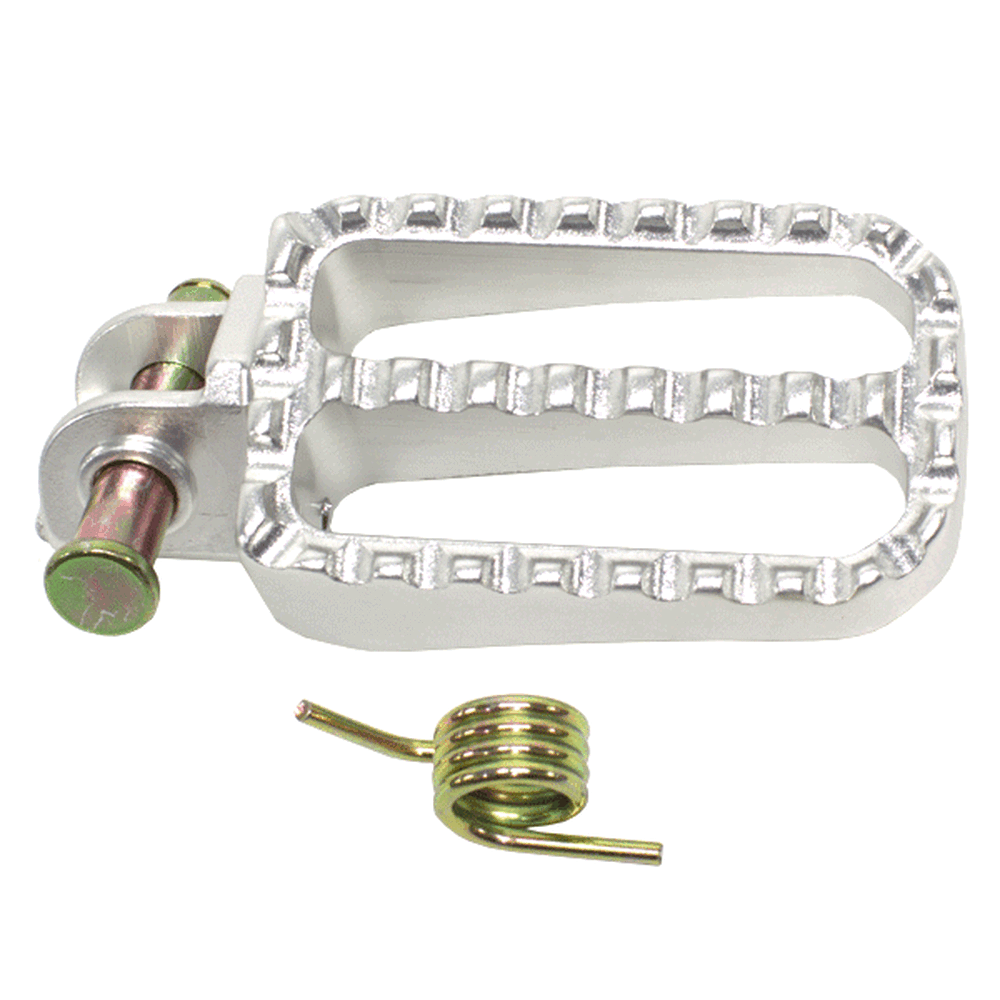 The footpeg with bracket in a motorcycle provides a secure place for the rider's foot while riding, supporting weight and aiding in balance, with the bracket ensuring proper attachment to the frame.