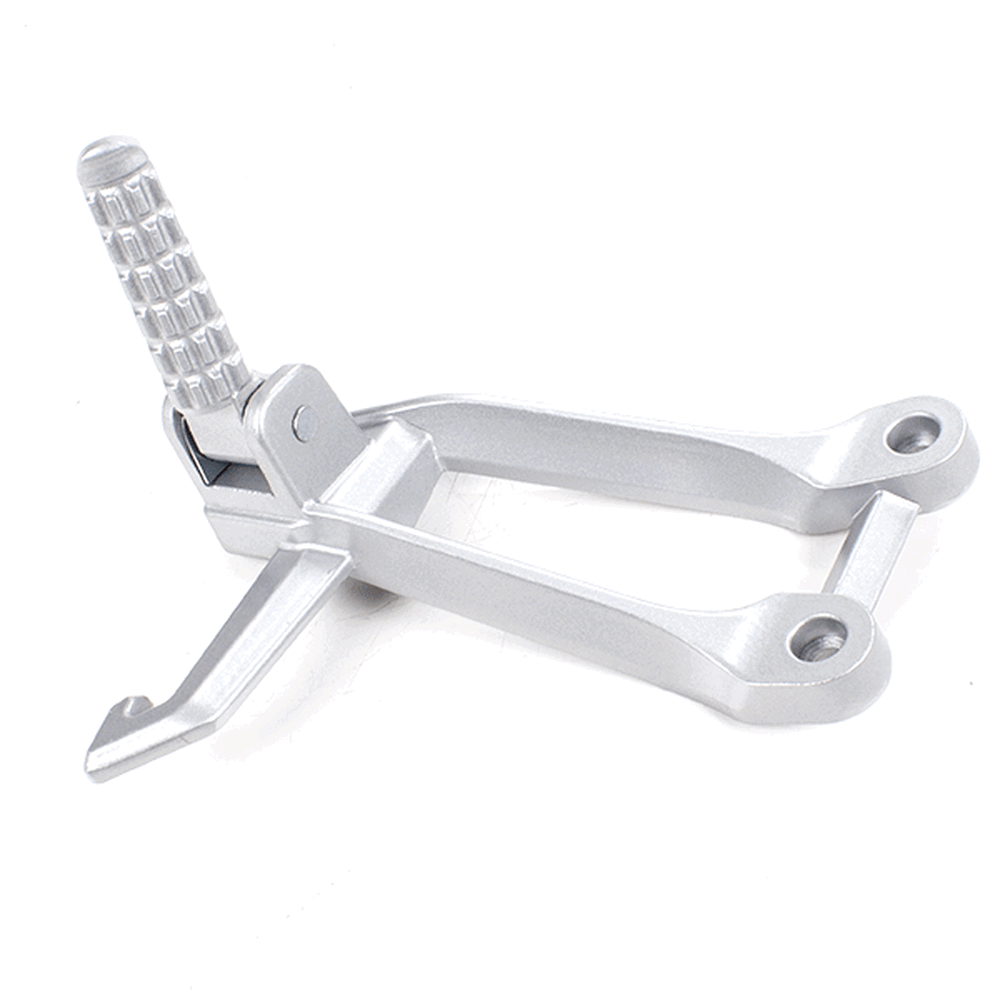 The footpeg with bracket in a motorcycle provides a secure place for the rider's foot while riding, supporting weight and aiding in balance, with the bracket ensuring proper attachment to the frame.
