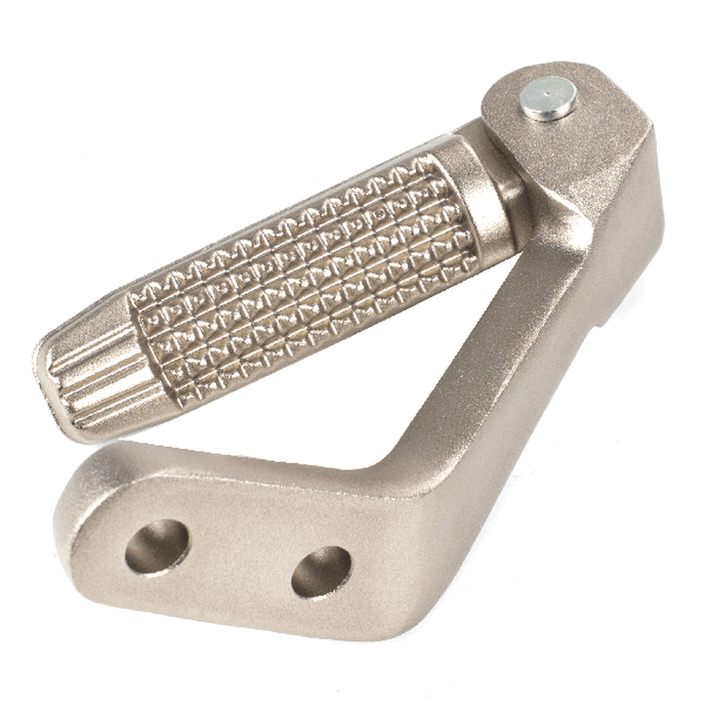 The footpeg with bracket in a motorcycle provides a secure place for the rider's foot while riding, supporting weight and aiding in balance, with the bracket ensuring proper attachment to the frame.