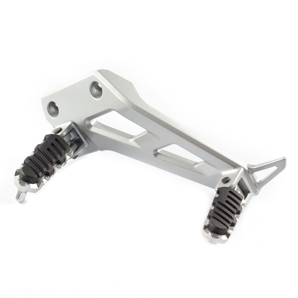 The footpeg with bracket in a motorcycle provides a secure place for the rider's foot while riding, supporting weight and aiding in balance, with the bracket ensuring proper attachment to the frame.
