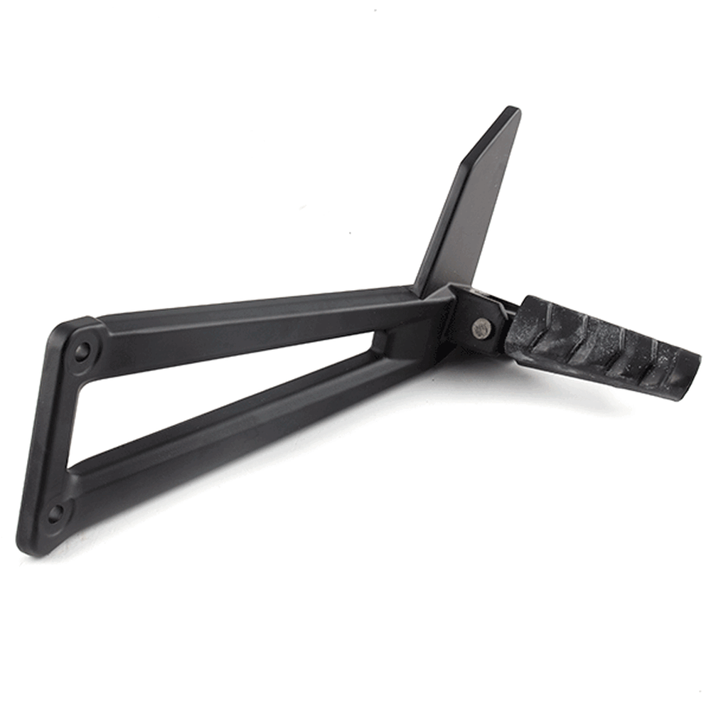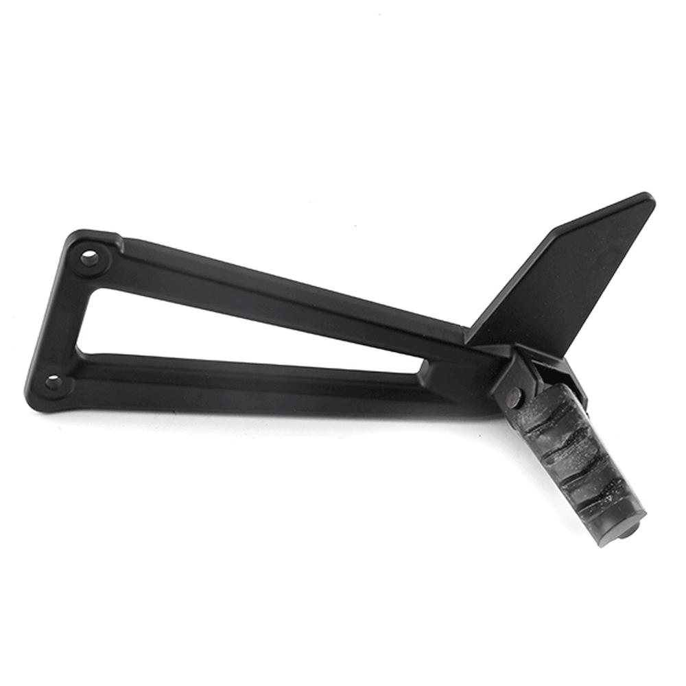 The footpeg with bracket in a motorcycle provides a secure place for the rider's foot while riding, supporting weight and aiding in balance, with the bracket ensuring proper attachment to the frame.