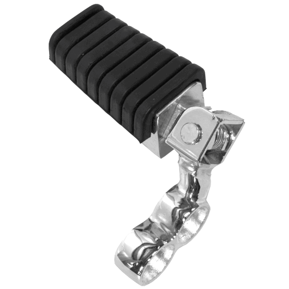 The footpeg with bracket in a motorcycle provides a secure place for the rider's foot while riding, supporting weight and aiding in balance, with the bracket ensuring proper attachment to the frame.