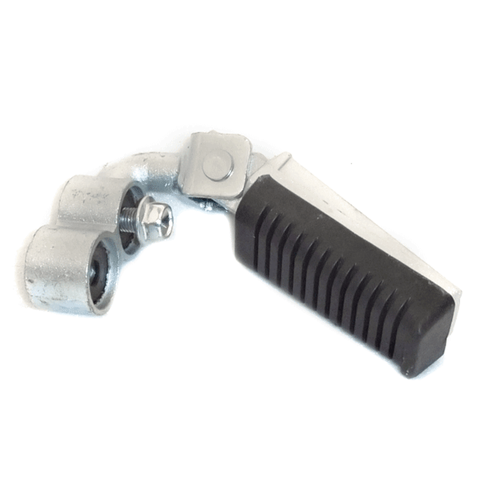 The footpeg with bracket in a motorcycle provides a secure place for the rider's foot while riding, supporting weight and aiding in balance, with the bracket ensuring proper attachment to the frame.