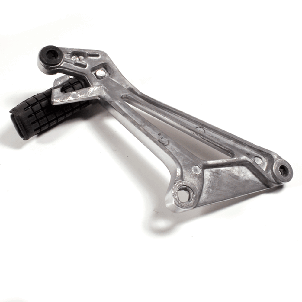 The footpeg with bracket in a motorcycle provides a secure place for the rider's foot while riding, supporting weight and aiding in balance, with the bracket ensuring proper attachment to the frame.