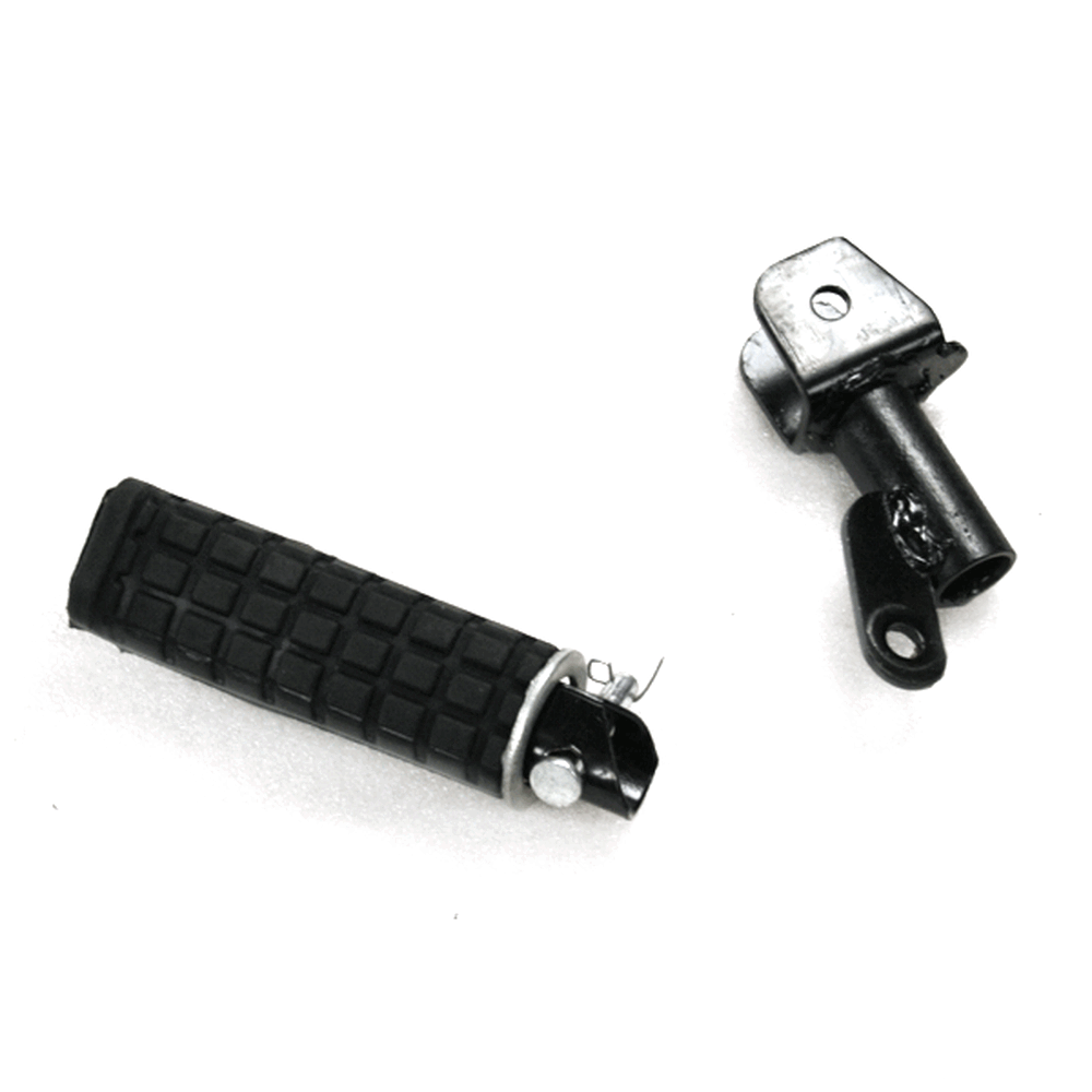 The footpeg with bracket in a motorcycle provides a secure place for the rider's foot while riding, supporting weight and aiding in balance, with the bracket ensuring proper attachment to the frame.