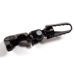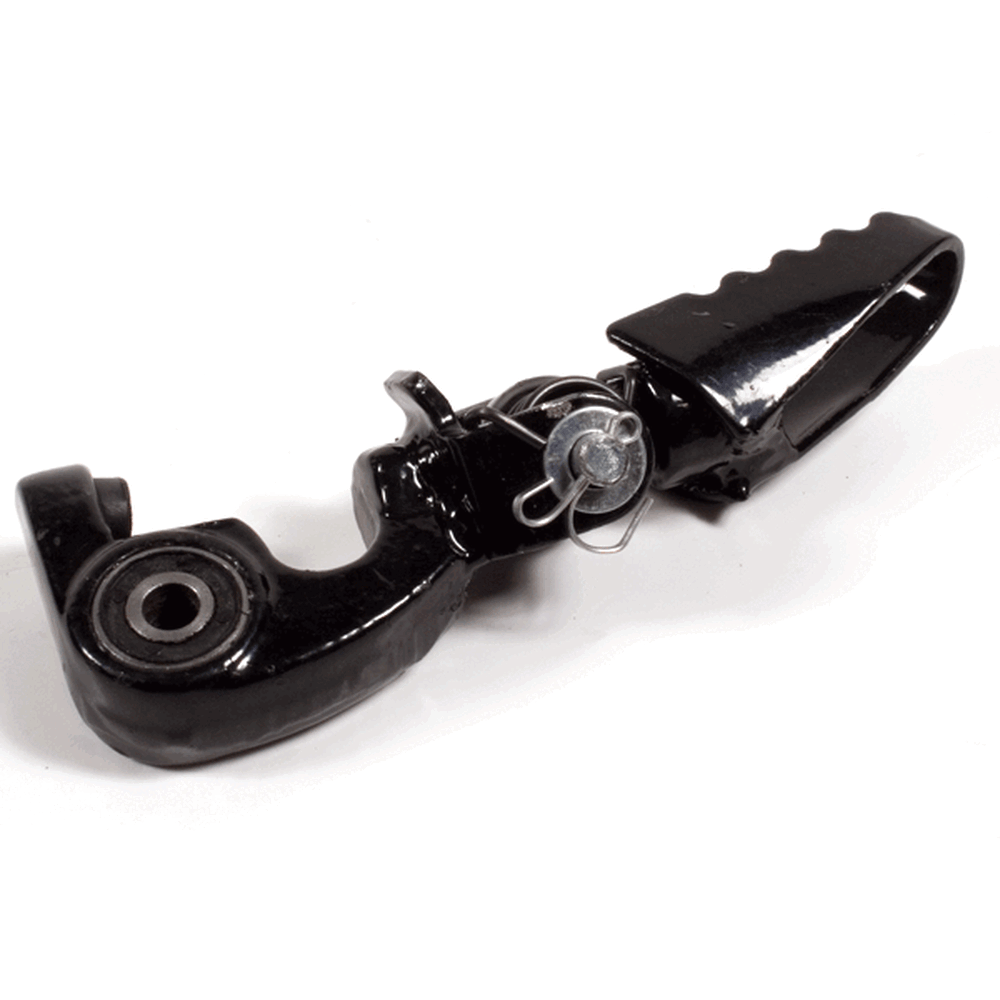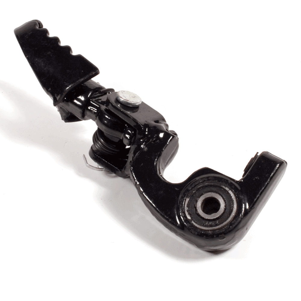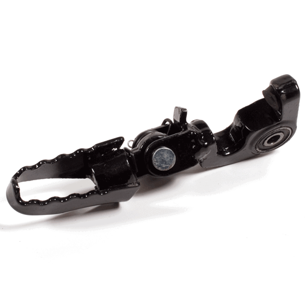 The footpeg with bracket in a motorcycle provides a secure place for the rider's foot while riding, supporting weight and aiding in balance, with the bracket ensuring proper attachment to the frame.