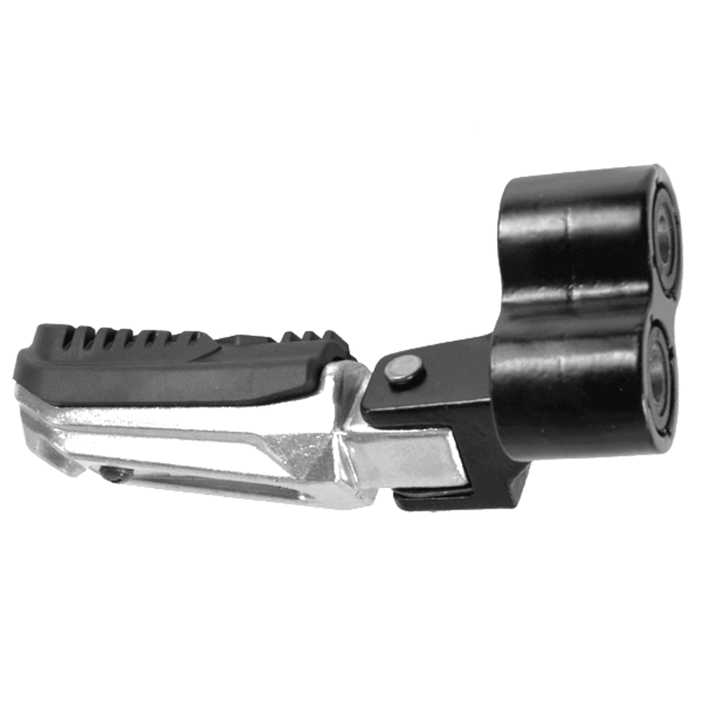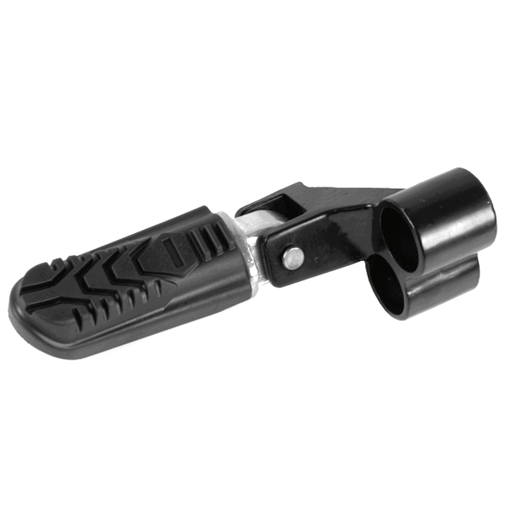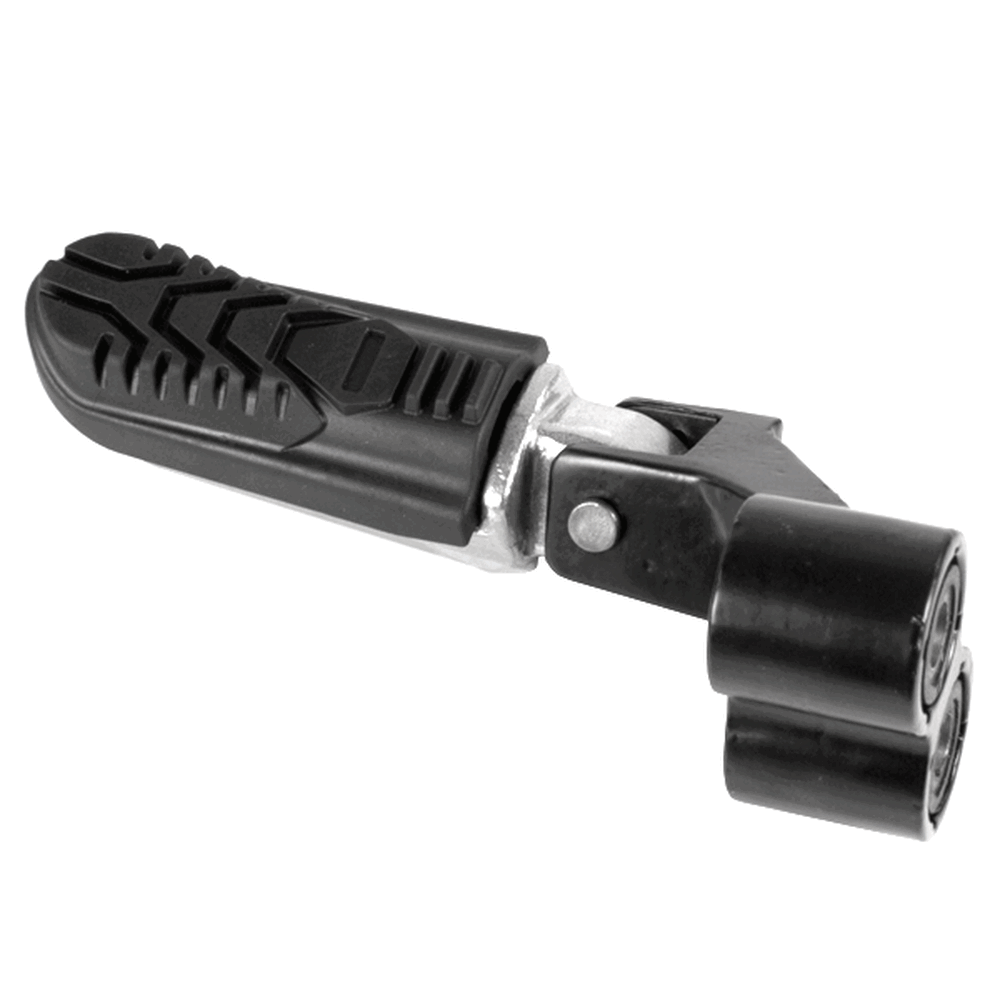 The footpeg with bracket in a motorcycle provides a secure place for the rider's foot while riding, supporting weight and aiding in balance, with the bracket ensuring proper attachment to the frame.